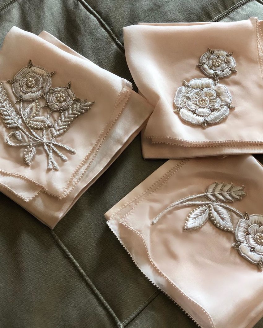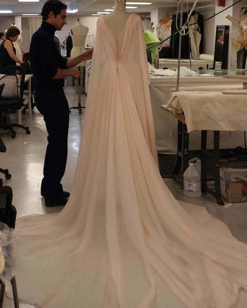 Através das redes socias do estilista, descobrimos imagens inéditas de inúmeros detalhes do design rosa, inspirado na beleza de Windsor e nos campos que o rodeiam. A tonalidade escolhida recria a Rosa Branca de York, símbolo da Casa de York, que foi discretamente bordada no ombro do vestido.