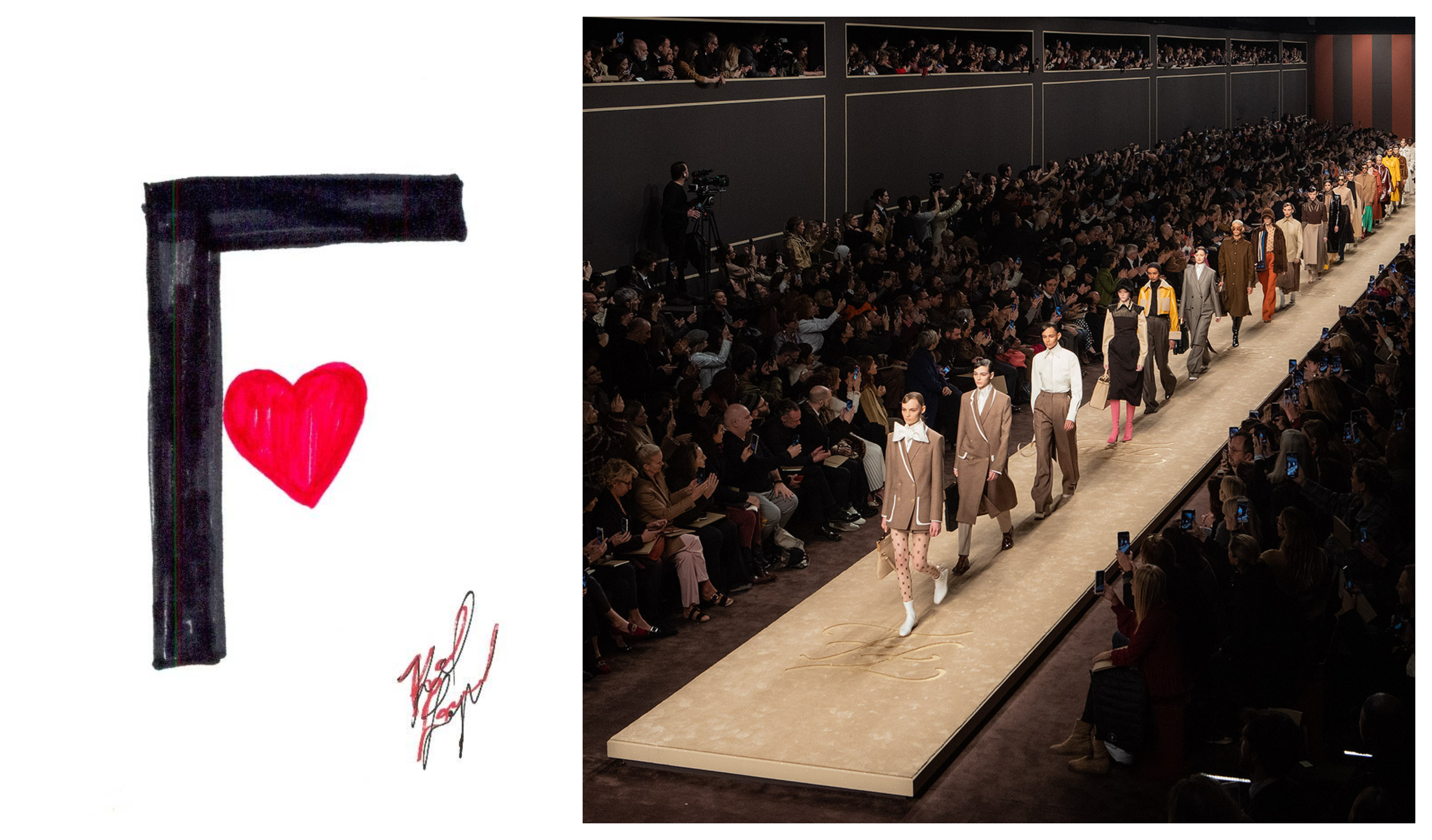 O logotipo que o Kaiser criou para a marca italiana, esteve presente em toda a parte. A imagem do design também figurava nos convites, croquis e no vídeo exibido no final do desfile da apresentação da coleção de inverno 2019/2020, a última criada pelo alemão.