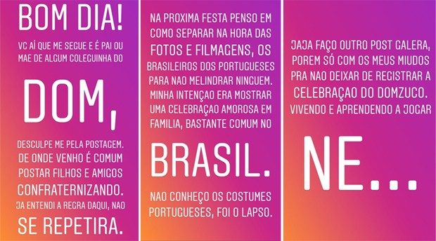 “Na próxima festa penso em como separar na hora das fotos e filmagens os brasileiros dos portugueses para não melindrar ninguém. Minha intenção era mostrar uma celebração amorosa em família, bastante comum no Brasil. Não conheço os costumes portugueses, foi o lapso. Já já faço outro post galera, porém só com os meus miúdos para não deixar de registrar a celebração do Dom. Vivendo e aprendendo a jogar, né?“, sublinhou.