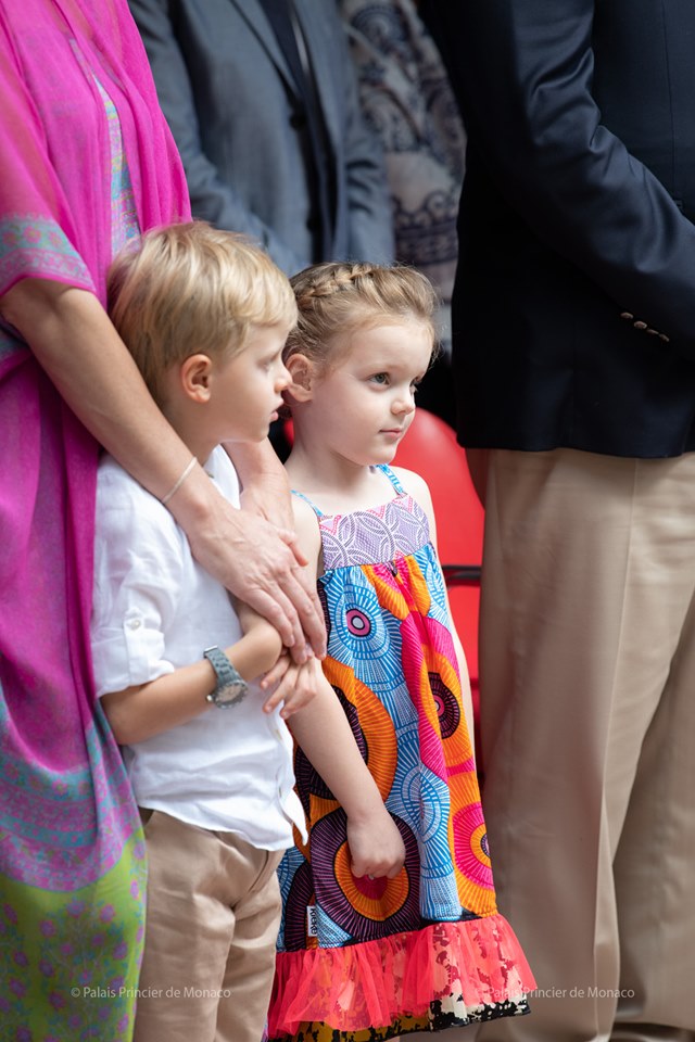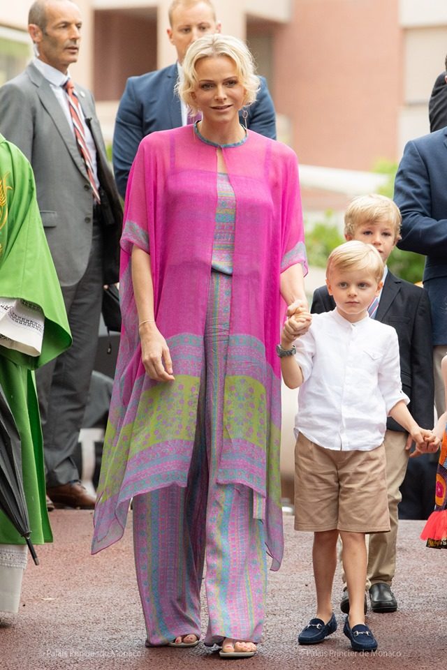 A pequena Gabriella, usou um vestido de alças com estampado étnico em tons de laranja, vermelho e azul. Por seu lado, Charlene, escolheu um macacão vaporoso, que combinou com uma túnica do mesmo padrão de cores fúcsia, malva, azul e verde.