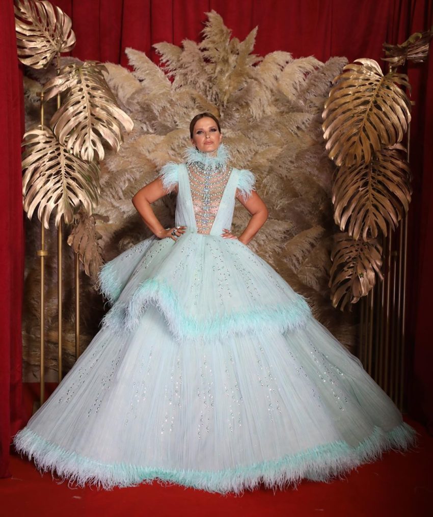 O terceiro demorou 870 horas a ser feito pelo criador João Rolo. Um vestido deslumbrante em azul turquesa, com penas, bordados e um decote com aplicações de joias.