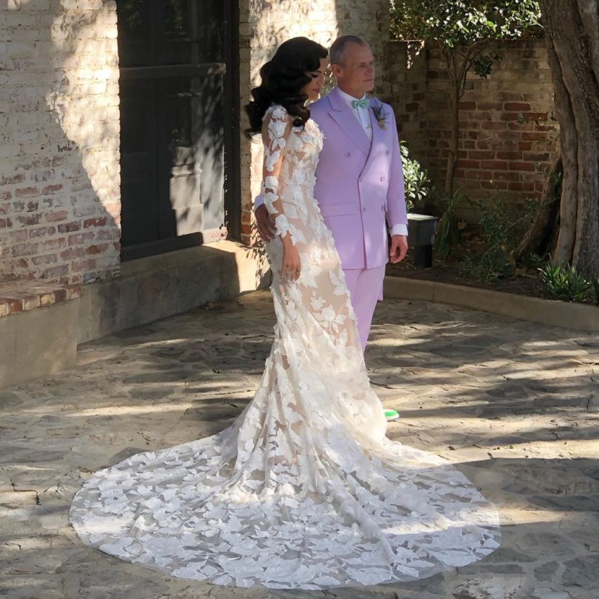 Melody deslumbrou com um vestido de noiva branco em renda e com cauda, perfeito para o outono, graças ao aplique de renda floral e mangas compridas. Completou o visual com um véu curto e um buquê branco.
