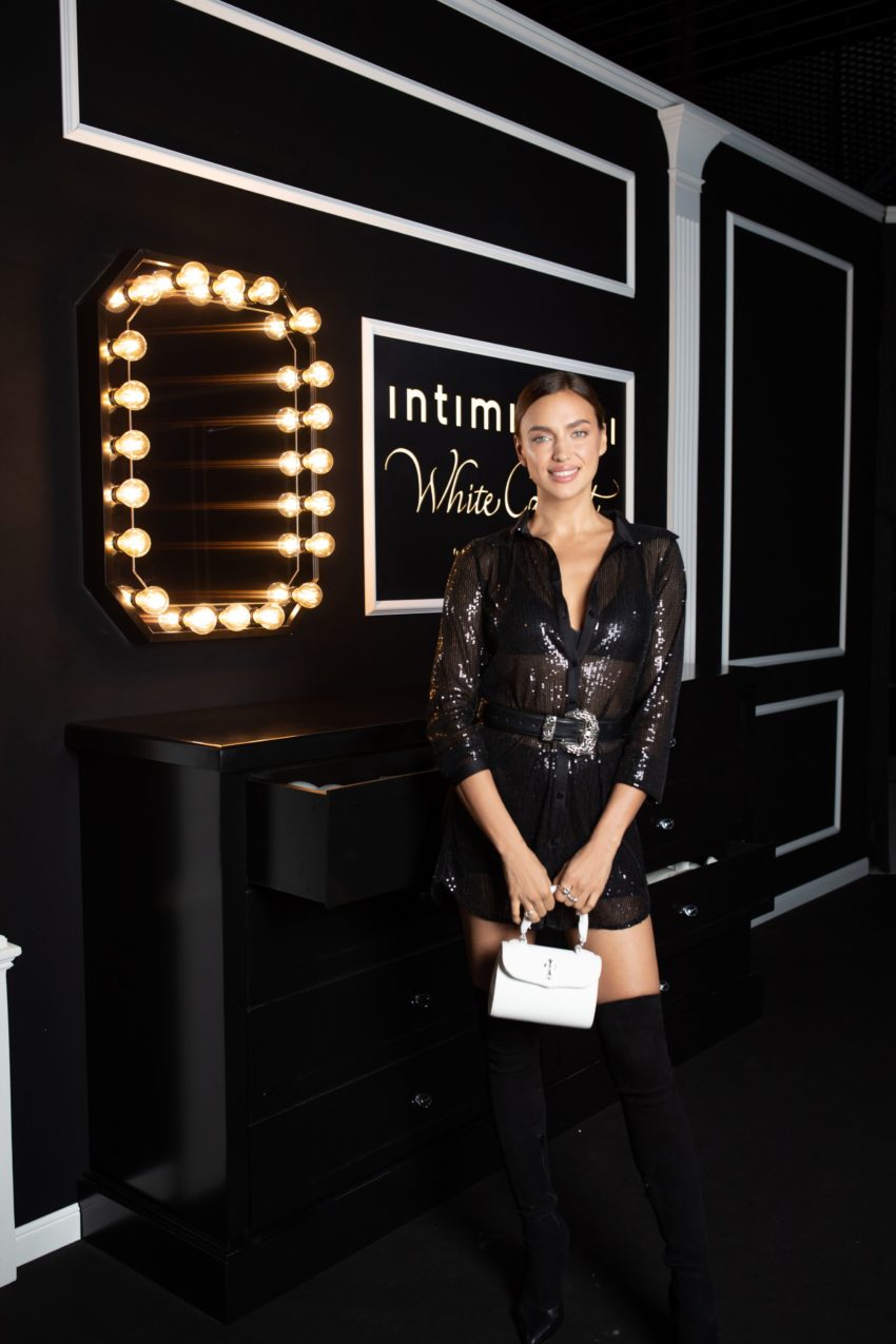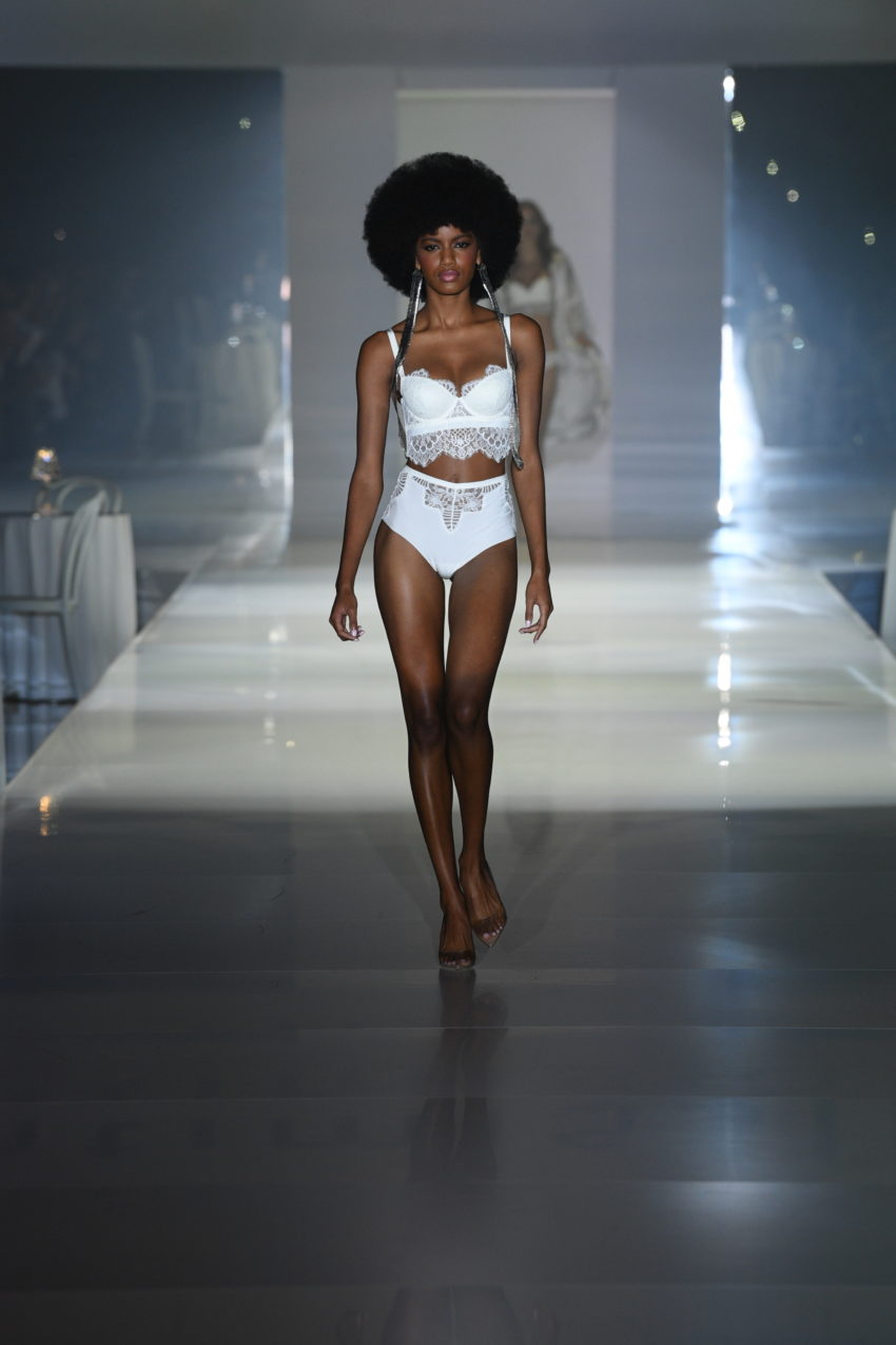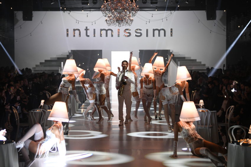 White Cabaret da Intimissimi – Milhares de luzes, grandes lustres com pingentes em cristal e em cascata, numa atmosfera de café-concerto, preparam o palco para o desfile.