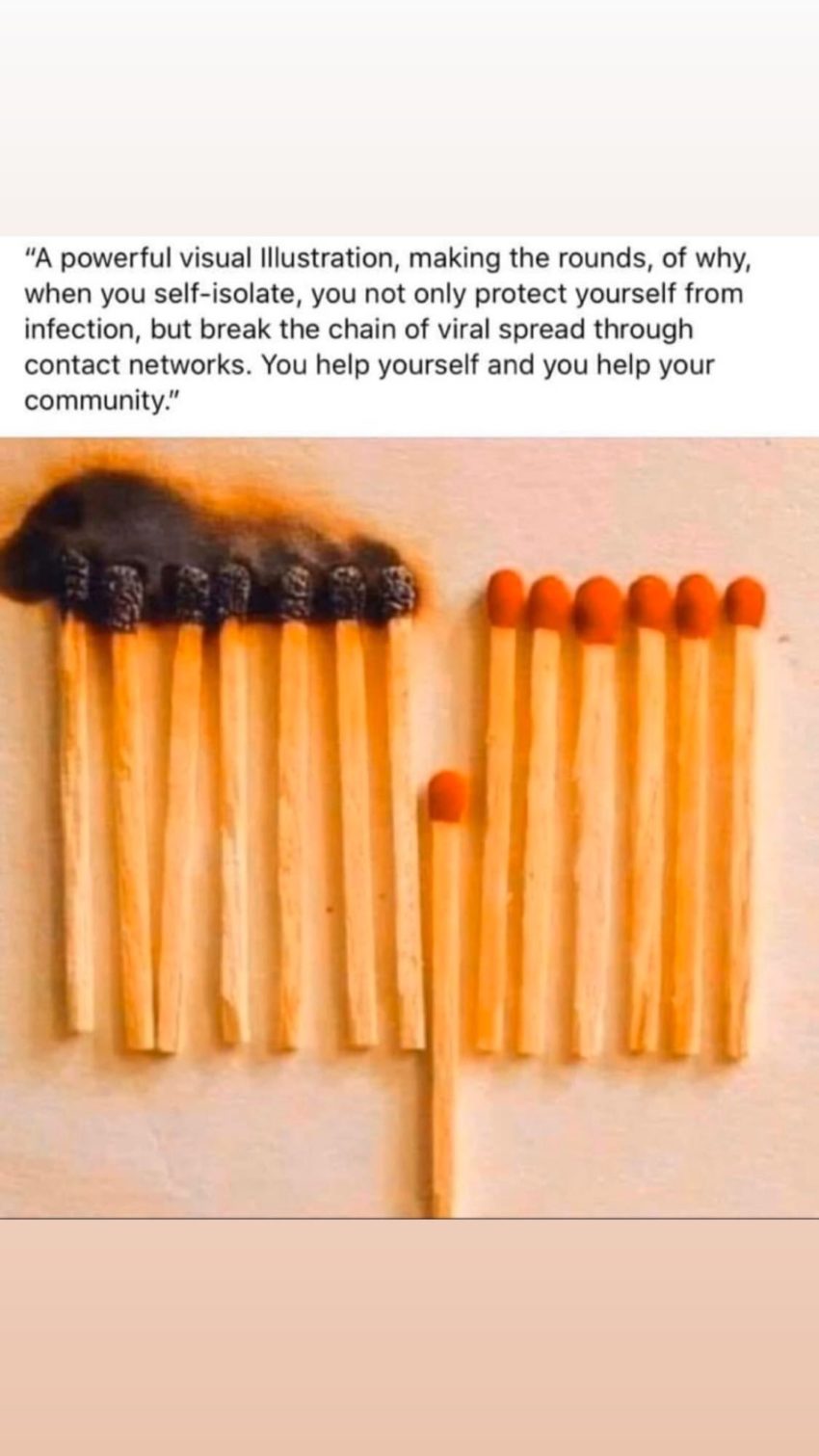 “Uma poderosa ilustração visual do porquê, quando você se isola, não apenas se protege da infeção, mas também quebra a cadeia de propagação viral à volta dos seus contatos. Você ajuda-se e ajuda a sua comunidade“, escreveu a jornalista na imagem partilhada.