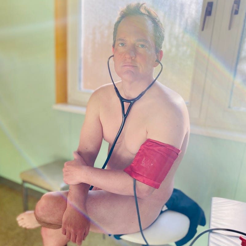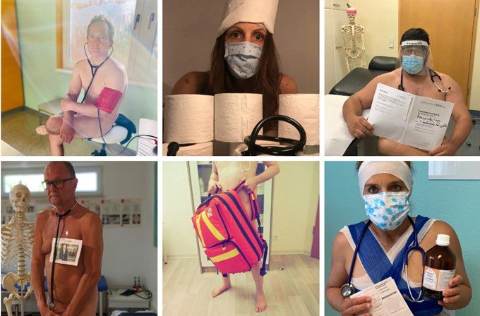 Nas fotografias divulgadas os profissionais de saúde surgem a cumprir as suas funções regulares sem roupa, tapados apenas com instrumentos médicos ou pastas.