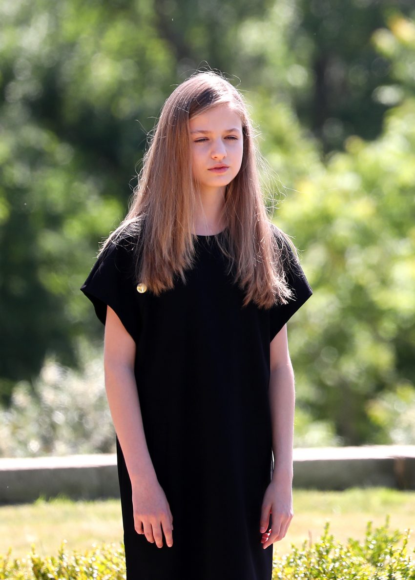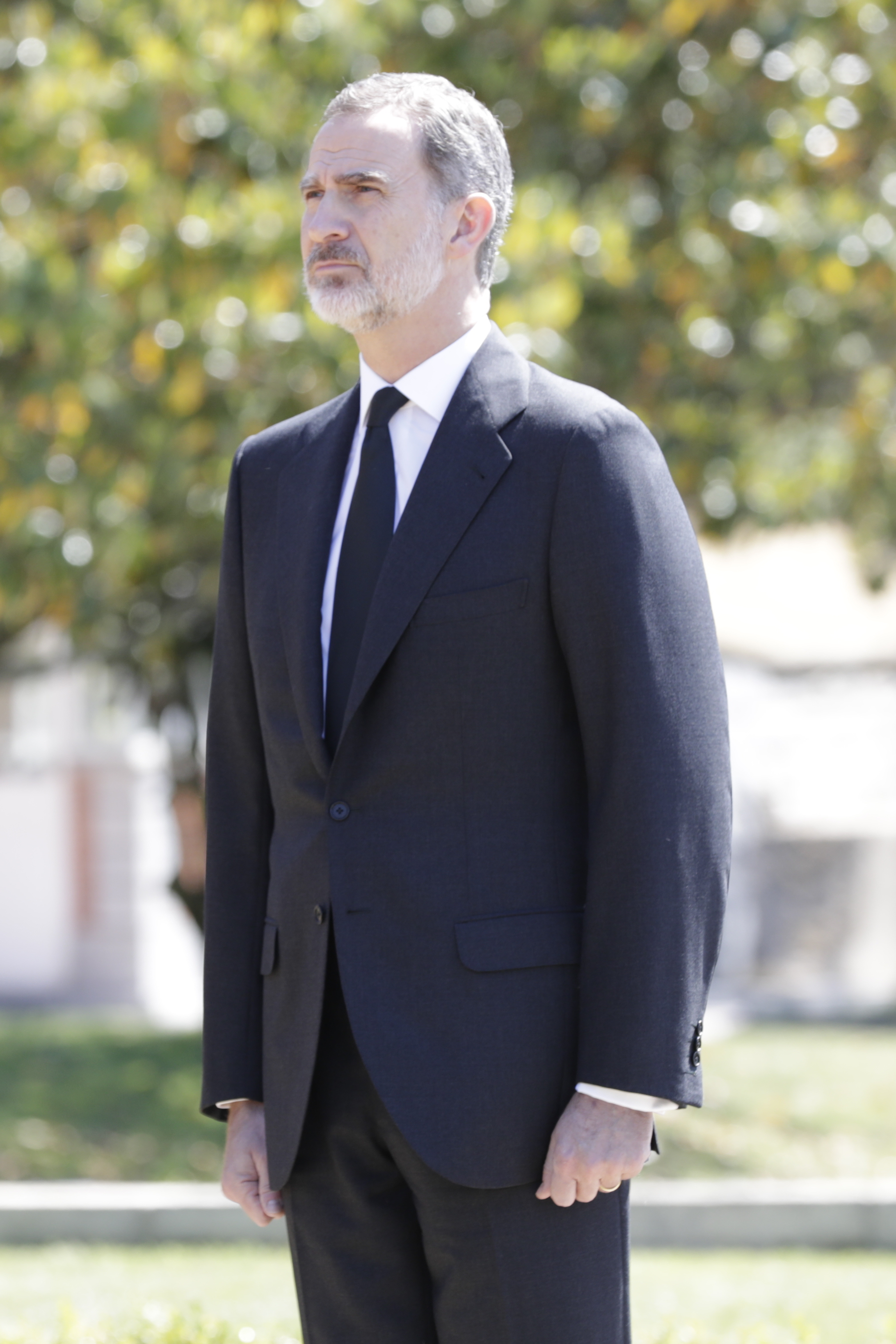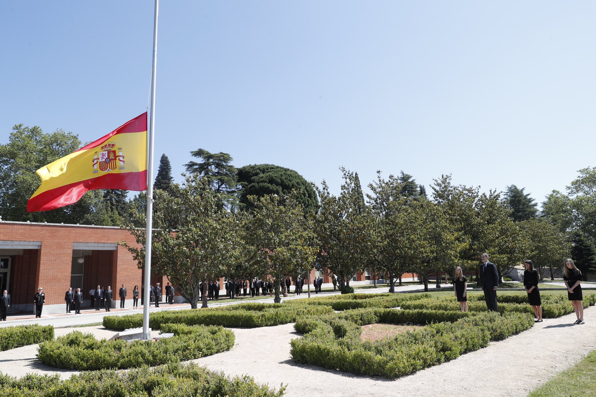 Vestidos de preto, incluindo as princesas, os monarcas cumpriram um minuto de silêncio próximo à bandeira de Espanha hasteada a meia-haste em frente à fachada do edifício do palácio da Zarzuela.