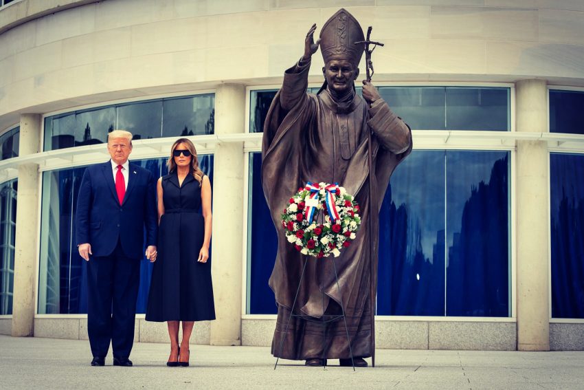 Melania acompanhou o presidente Donald Trump na visita ao memorial de João Paulo II, em Washington, onde colocaram uma coroa de flores em homenagem ao Papa polaco, numa altura em que o país está em protesto devido à morte de George Floyd, provocada por um agente da polícia.