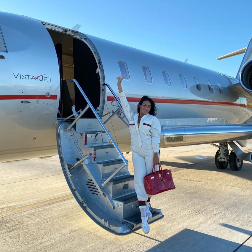 Antes de entrar no jato particular, Georgina Rodriguez mostrou o original look que escolheu para viajar. Gucci foi a marca escolhida para a ocasião. A jovem elegeu um macacão branco, meias e sapatilhas da famosa marca italiana. Apenas a carteira fugiu à regra. Na mão, Gio exibiu a sua Birkin vermelha da Hermès.