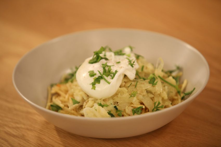 7. Antes de comer dê um golpe no ovo para que a gema se espalhe pelo preparado.