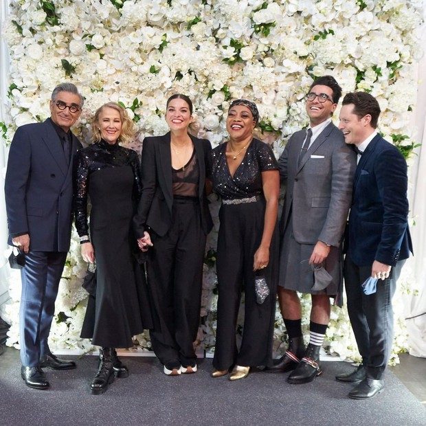 O elenco de Schitt’s Creek juntou-se e fez a sua própria red carpet. Com looks monocromáticos, escolheram o preto ou cinza. A série foi a grande vencedora da noite.