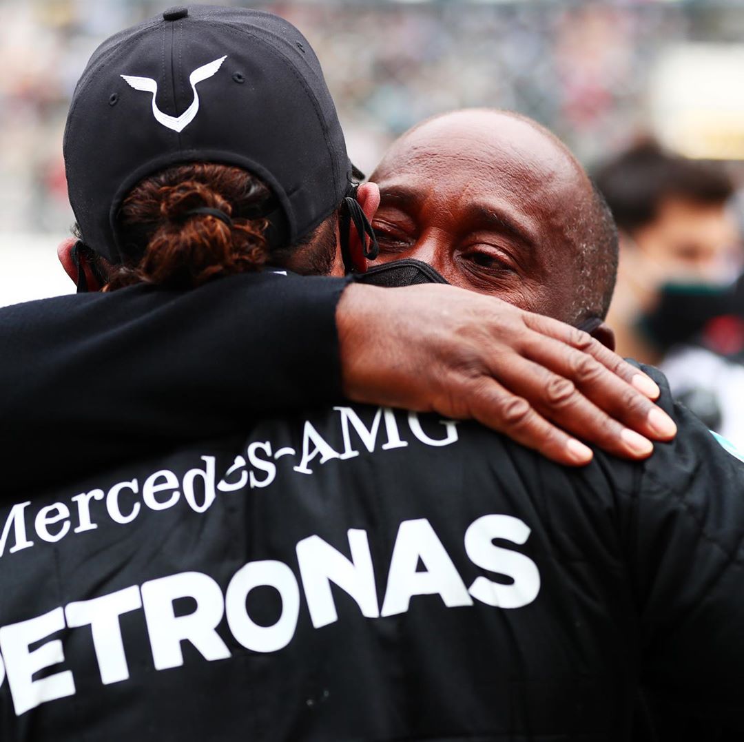 Na comemoração de mais uma marca histórica, Hamilton abraçou emocionado o pai, Anthony.