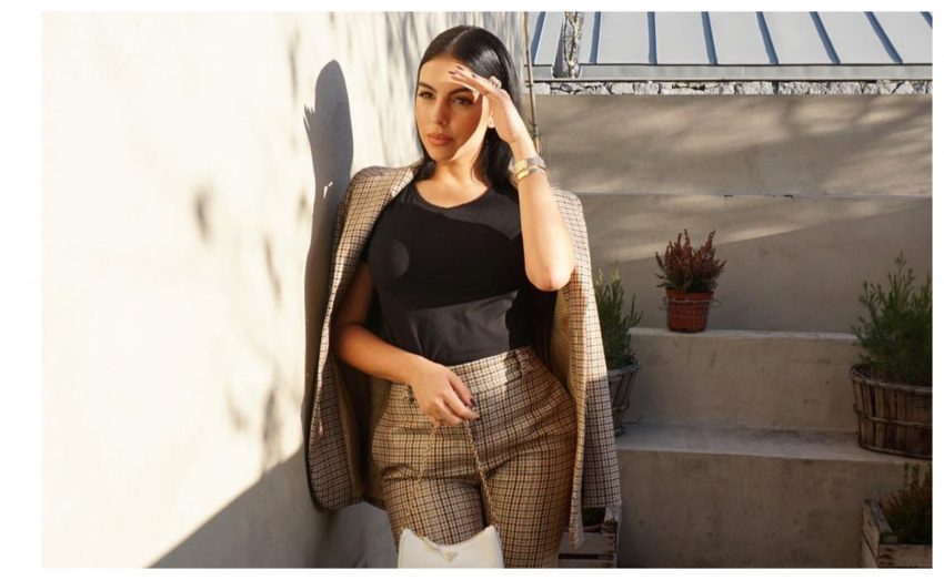 Para a ocasião Georgina Rodriguez, de 26 anos, optou por usar um fato, calça e blazer em xadrez bege, com assinatura da marca italiana Ermanno Scervino, que combinou com uma blusa preta simples, e saltos altos. Um look bem diferente daquele estilo rapper do início dos anos 90, que escolheu para usar na viagem.
