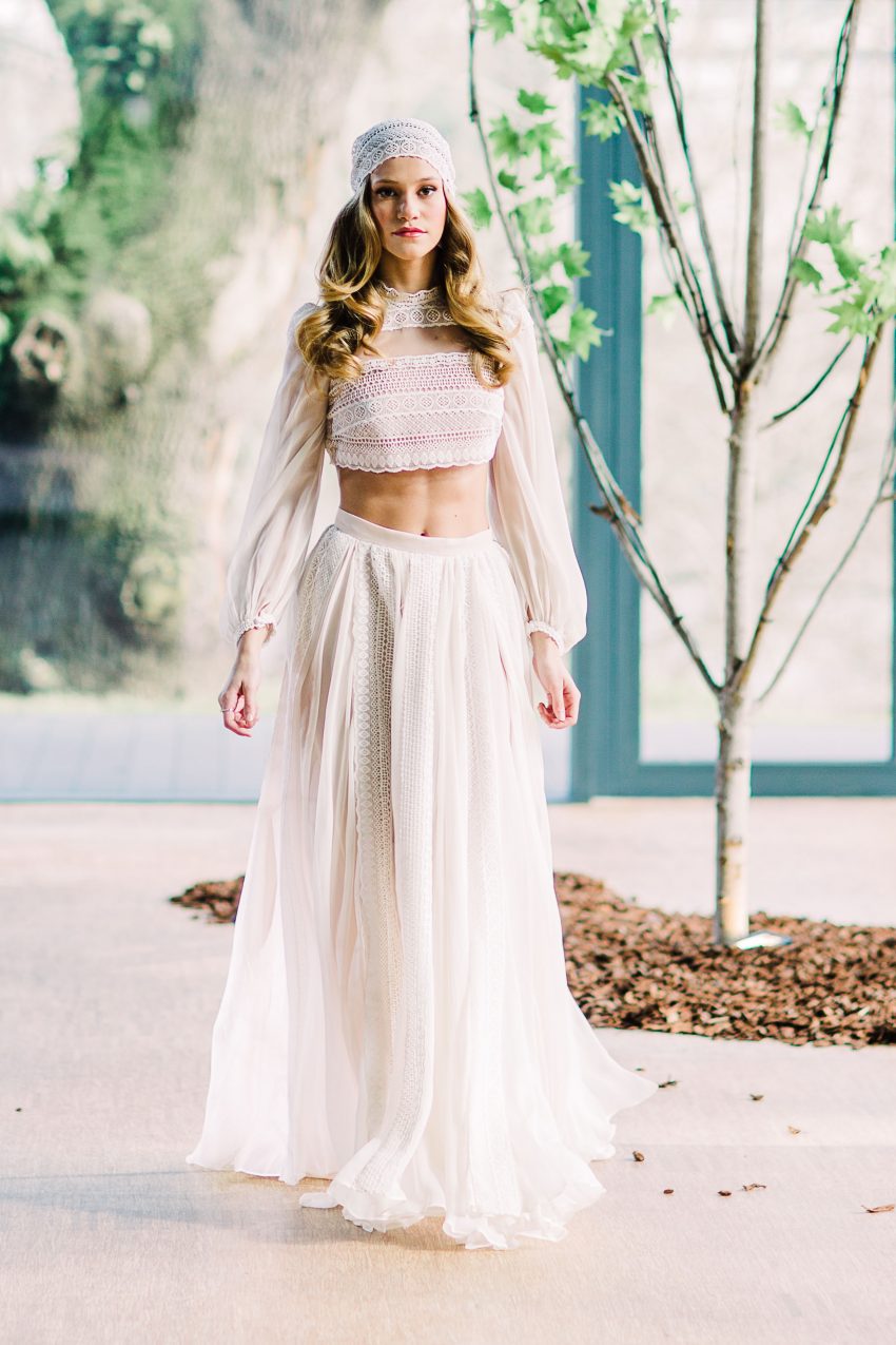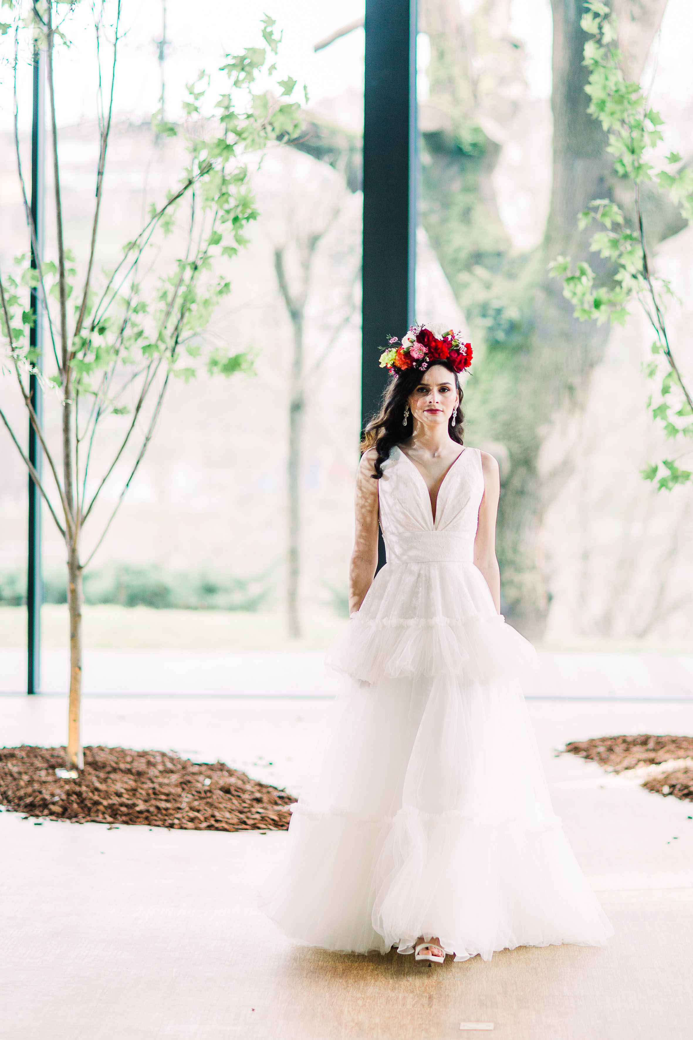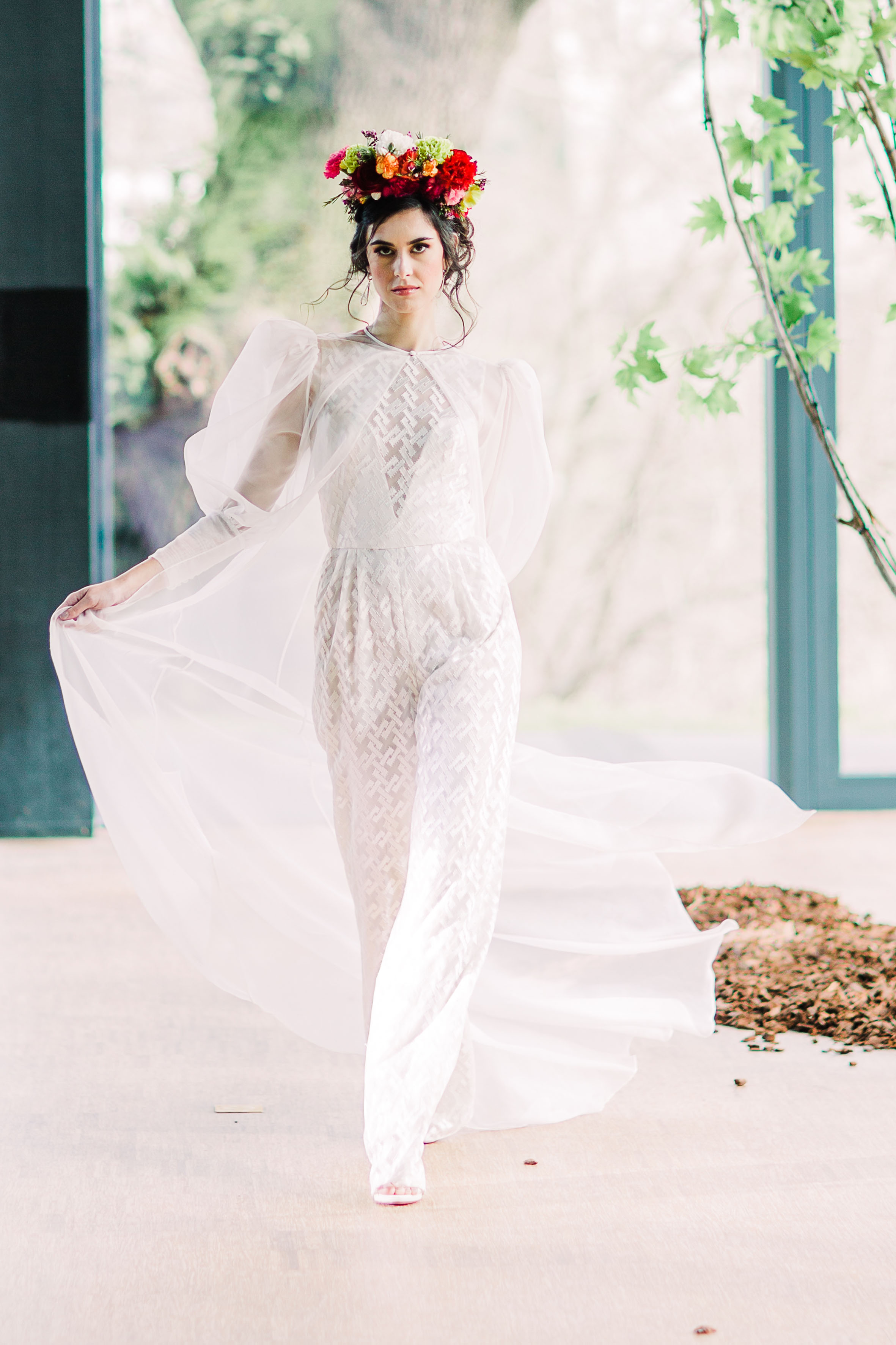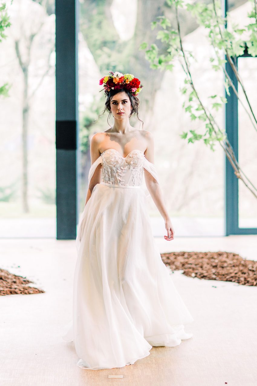 A ousada coroa de flores que adornava os cabelos das modelos, composta por cravos e rosas vermelhas, rapidamente revela a inspiração para esta coleção. Gio Rodrigues foi aos países latinos do sul da Europa, como Espanha ou Itália, buscar referências para as suas propostas. Rendas, tule e transparências em tons de branco puro compõem esta coleção, altamente feminina e elegante. Decotes em V e em coração, cinturas marcadas, saias esvoaçantes e mangas abalonadas foram as grandes apostas de Gio Rodrigues, que desenhou esta coleção a pensar nos casamentos ao ar livre, a escolha de muitos noivos em 2020 e que se prevê que se mantenha em 2021.