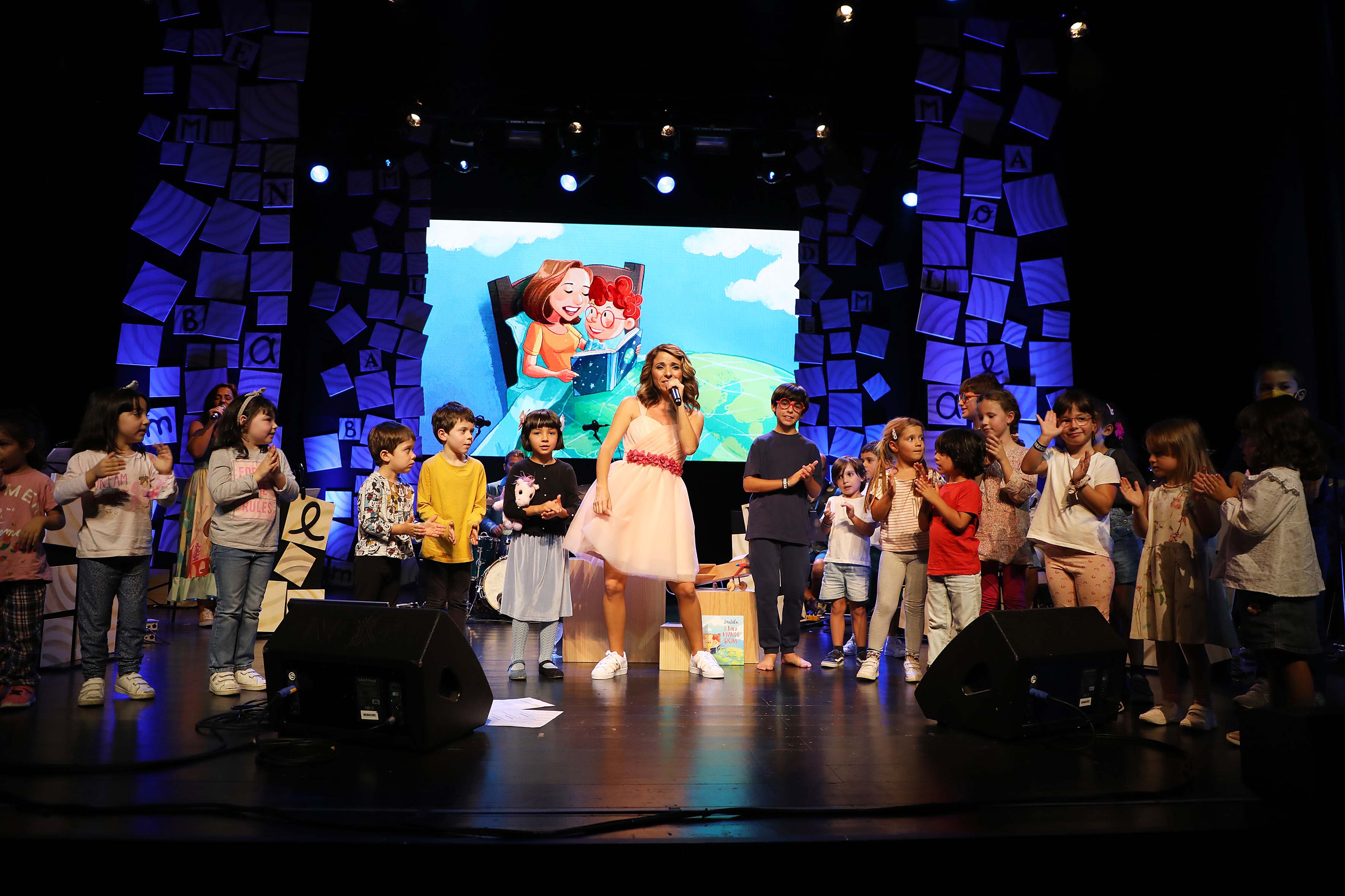 No palco existe muita animação e um coro de crianças.