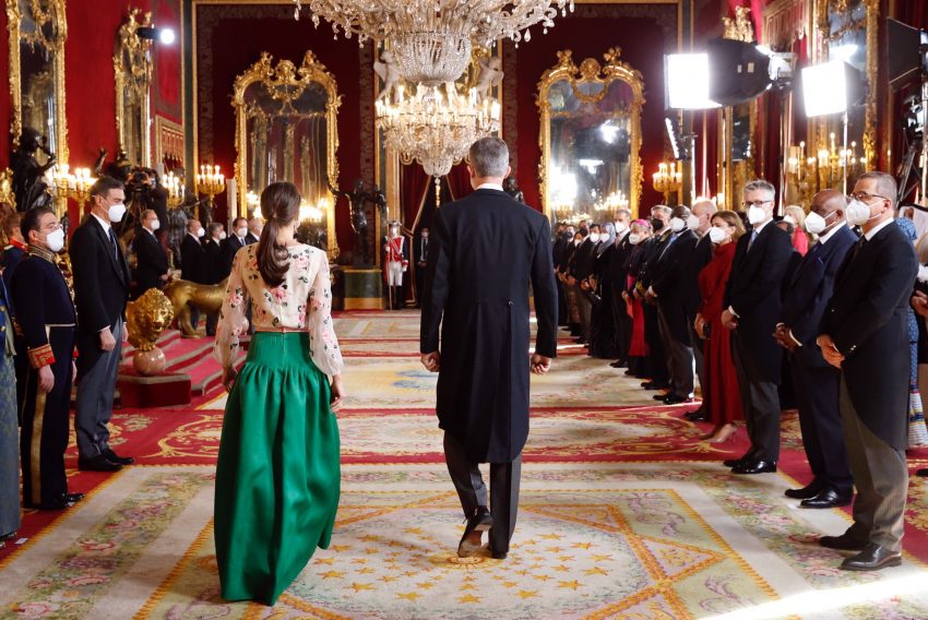 Para a receção ao Corpo Diplomático, que teve lugar esta segunda-feira, no Palácio Real de Madrid, Letizia compareceu com um visual primaveril, uma saia verde comprida de cintura alta com uma blusa com flores rosa estampadas e folhas verdes, da mesma cor da saia, de mangas em balão. As duas peças pertenciam à rainha emérita Sofía, que as usou em várias ocasiões, nomeadamente num encontro com o então presidente da Alemanha, Walter Scheel, em 1977.