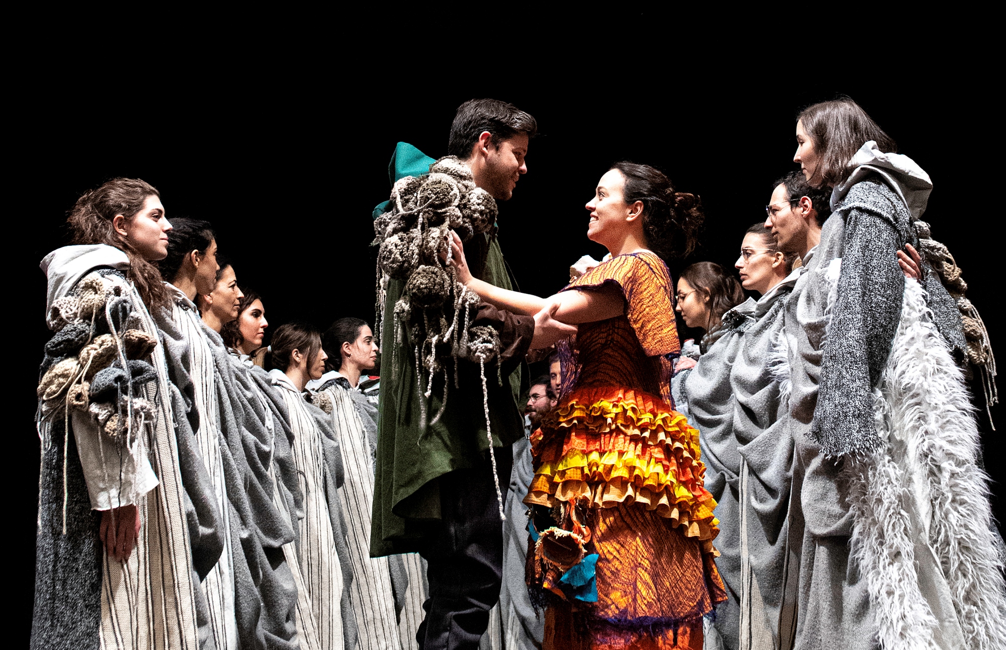 Quase tudo parece improvável neste projeto, estreado no final de 2021 em Vila Real. A começar pelos dez anos que demorou a chegar ao palco, e pelo facto de ser uma ópera onde os cenários são “vivos”. Para isso, o encenador Ángel Fragua recorreu aos vários elementos dos dois Coros participantes, que assumem o papel de várias personagens como a montanha, o rebanho de ovelhas ou a vinha. Para criar este “cenário vivo”, os figurinos criados por Cláudia Ribeiro foram fundamentais, assim como o jogo de luzes, concebido por Pedro Pires Cabral.