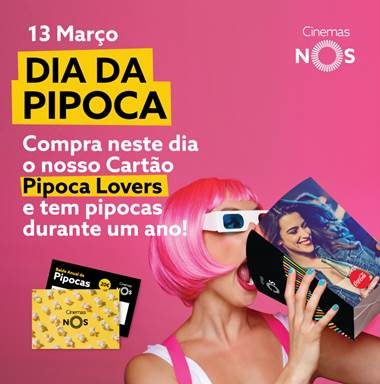 Este domingo, 13 de março, a NOS Cinemas vai celebrar o Dia da Pipoca com iniciativas muito especiais. De facto, as pipocas são as melhores companheiras dos espectadores de cinema e a pensar nos seus verdadeiros amantes – sejam doces, salgadas, mistas, com topping ou sem – a NOS Cinemas lança o Cartão Pipoca Lovers.