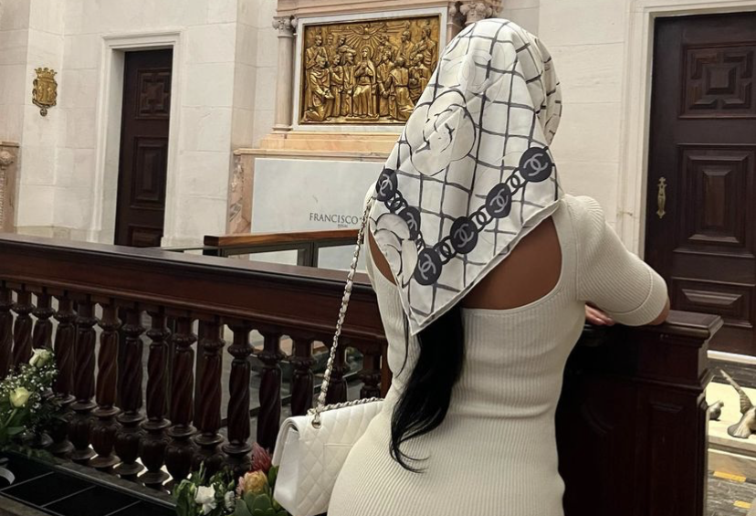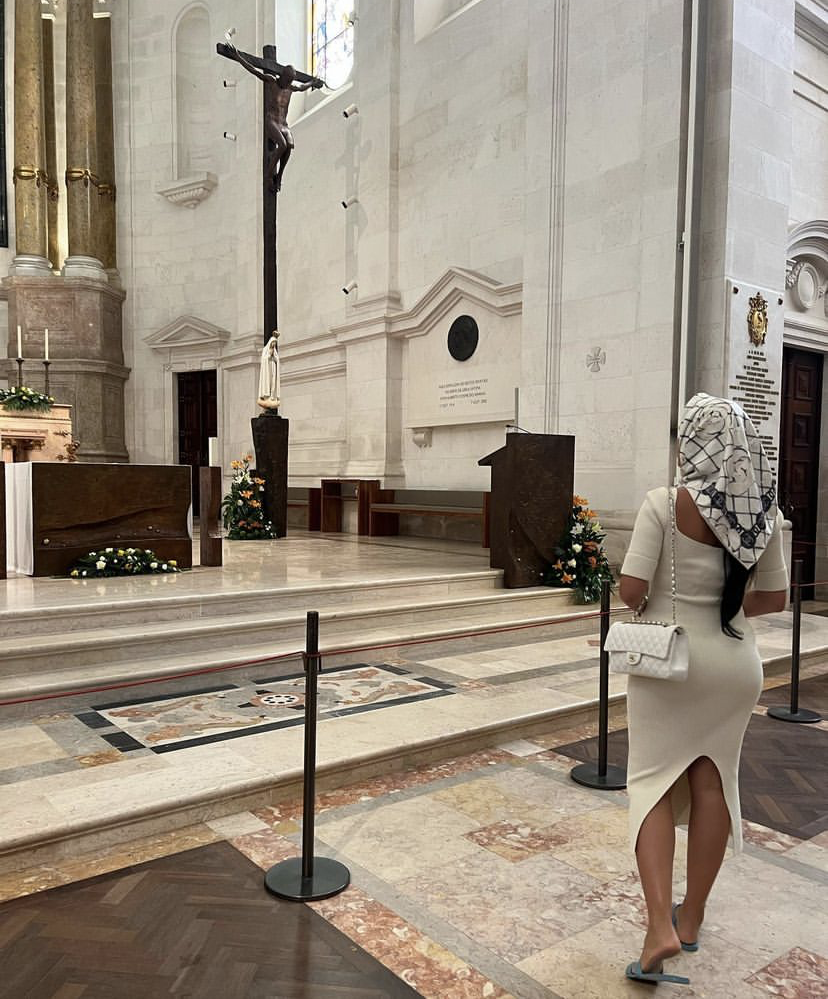 Para a ocasião Georgina escolheu um look discreto em tons de branco, chinelos rasos e tapou o cabelo com um lenço de seda, mostrando o seu respeito e devoção pela casa de Deus.