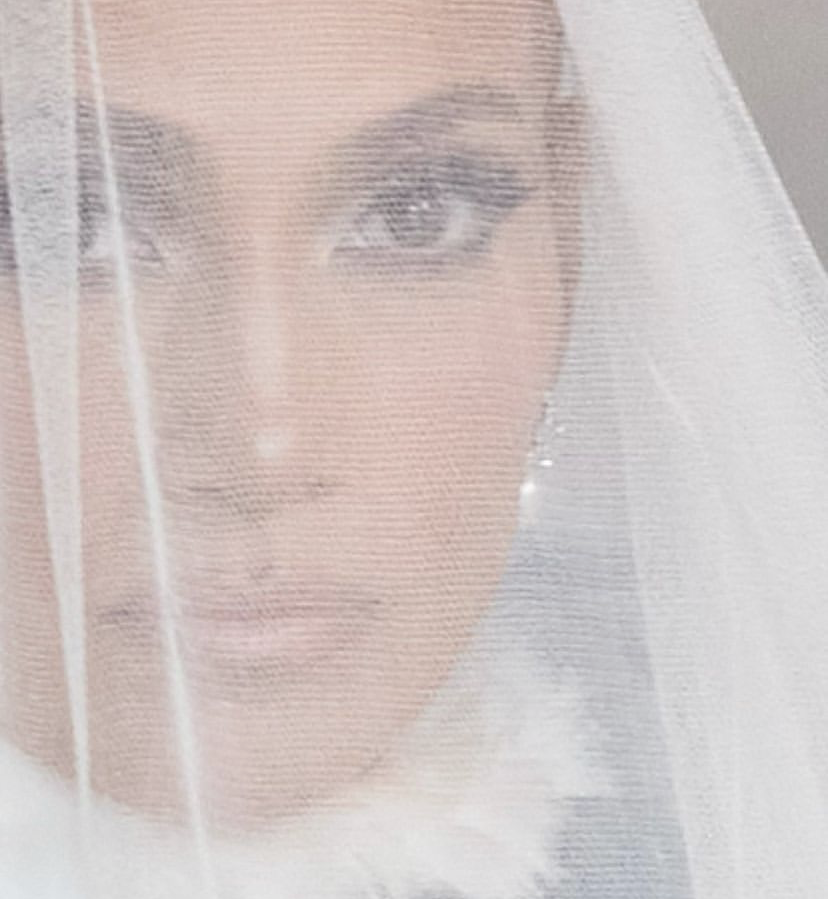 O primeiro modelo tinha um corte em sereia, que realçou a sua cobiçada silhueta curvilínea, com uma pequena gola alta, mangas curtas e costas abertas. O foco prende-se na cauda longa, que brinca com a construção de camadas e layers através da utilização e construção de folhos e franzidos. De acordo com o comunicado de imprensa feito pela marca, os encaixes ondulantes da cauda volumosa foram presos à mão e, combinam com o longo véu conferindo a esta peça um toque de romantismo e drama que foi completado com brincos de diamante delicados.
