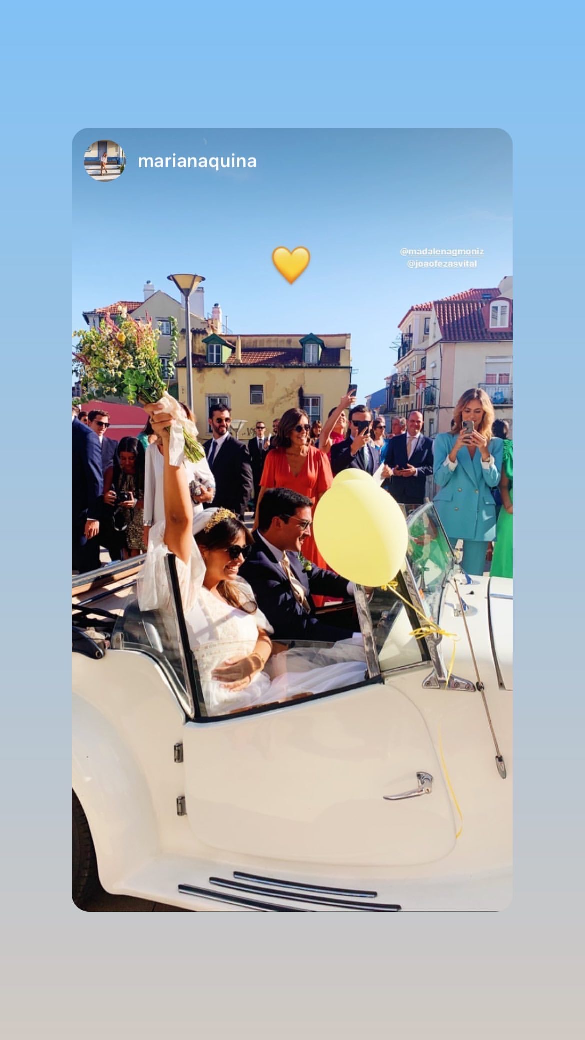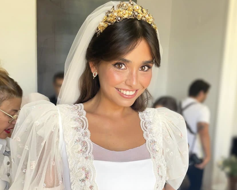 Madalena optou por usar um vestido branco com renda e mangas balão e o clássico véu na cabeça, onde se destacava uma tiara dourada.