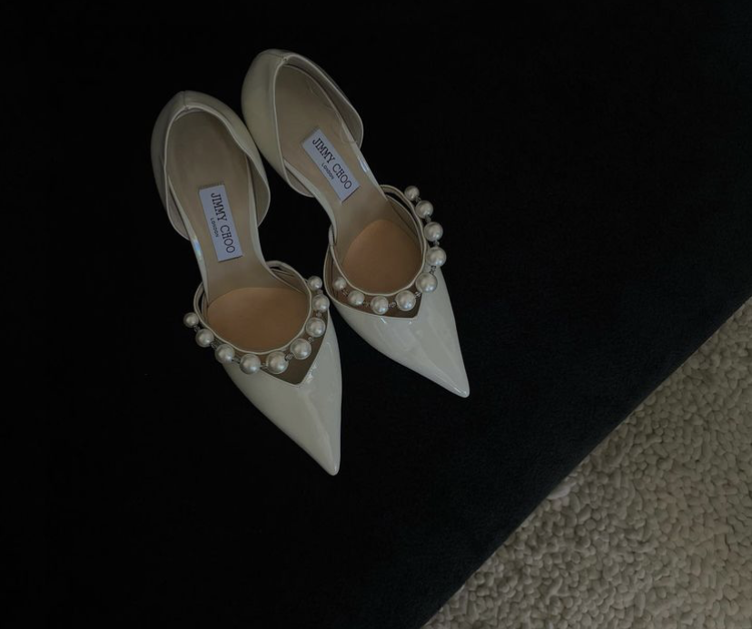 Para completar o visual, a noiva escolheu sapatos Jimmy Choo brancos com pérolas.