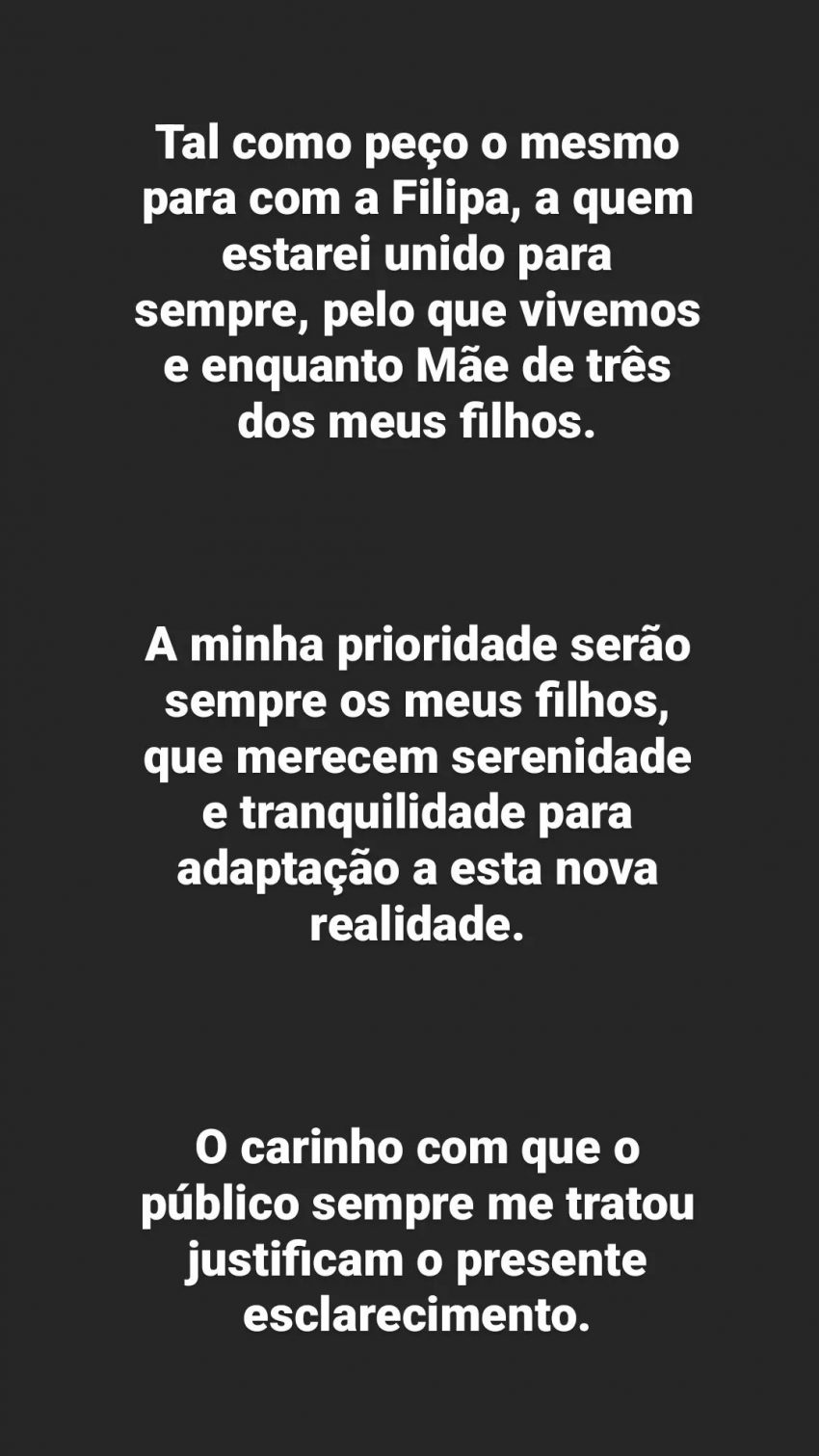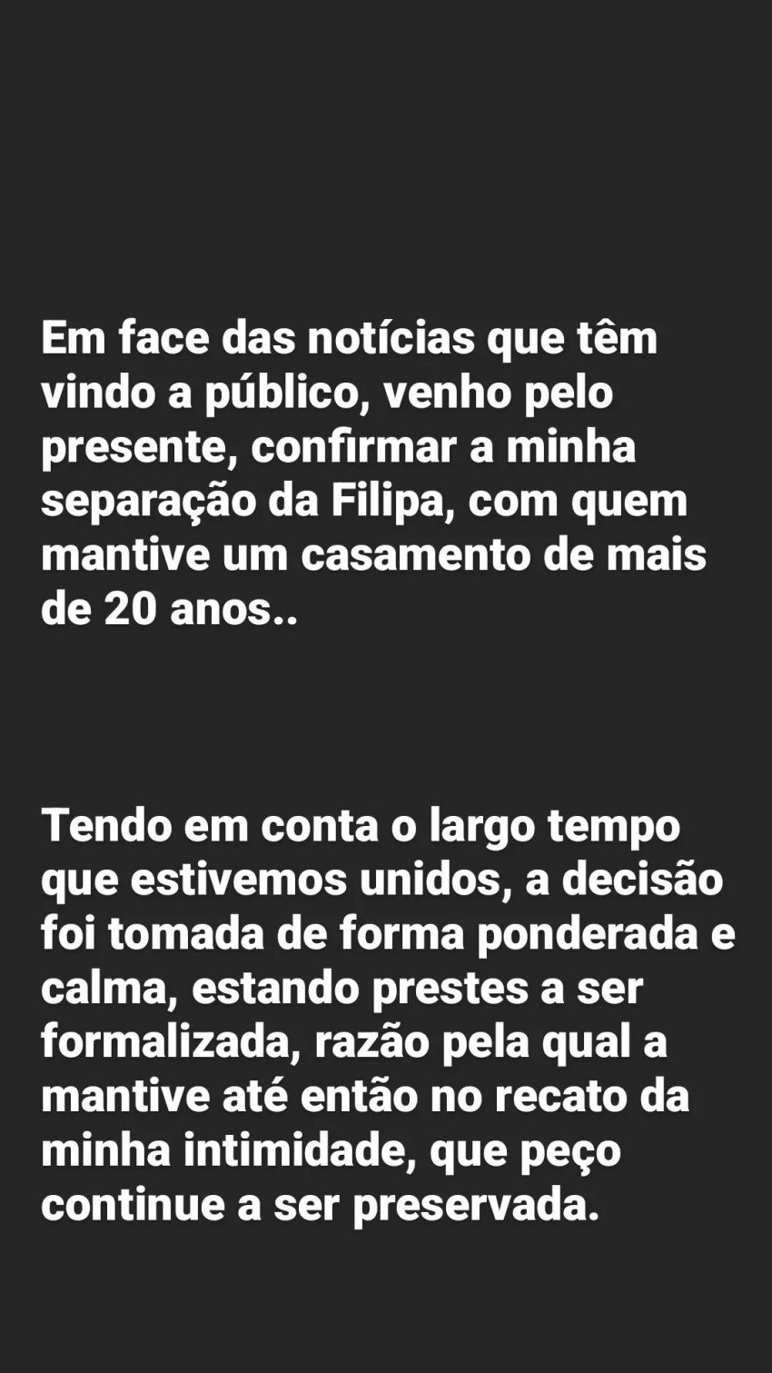 “Tendo em conta o largo tempo que estivemos unidos, a decisão foi tomada de forma ponderada e calma, estando prestes a ser formalizada, razão pela qual a mantive até então no recato da minha intimidade, que peço que continue a ser preservada. Tal como peço o mesmo para com a Filipa, a quem estarei unido para sempre, pelo que vivemos e enquanto Mãe de três dos meus filhos”, explicou.