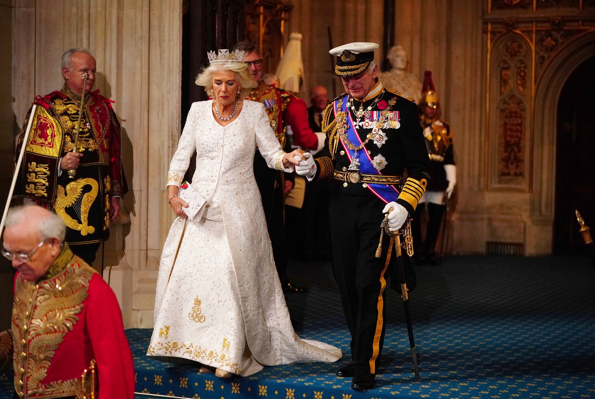 Camilla usou o mesmo vestido da coroação, um modelo desenhado por Bruce Oldfield, e pela primeira vez colocou a famosa Tiara de Estado de George IV. Esta joia, também conhecida como Tiara de Diamante, foi confecionada em 1820 e desde então tem sido usada por rainhas regentes e consortes em sucessivas coroações e aberturas do Parlamento. Já Carlos III usou para a ocasião solene – além da coroa – um longo manto de Estado e o uniforme de gala de Almirante da Frota Real.