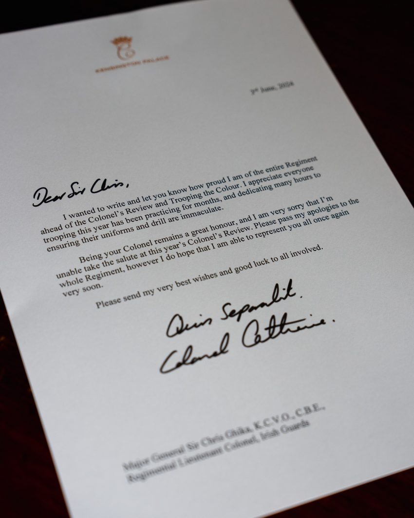 A Princesa de Gales, que enfrenta uma luta contra um cancro, pediu desculpas através de uma carta bastante emotiva, por não estar presente no ensaio para o Trooping The Colour. A missiva de Kate Middleton foi dirigida à Guarda Irlandesa onde dizia: “Espero poder representá-los em breve“.