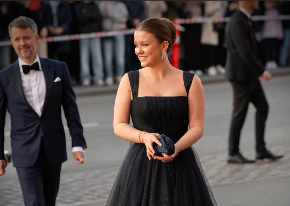 A jovem princesa brilhou com um vestido azul marinho de Jesper Hovring, coberto de glitter e tule. Um modelo de alças largas, decote quadrado, corpete com espartilho, faixa na cintura e saia evasê. Na parte de trás, apresentava um enfeite brilhante, que combinou com uns brincos de diamante da sua mãe. As restante das joias que ostentou foram três pulseiras, entre elas a pulseira Cartier Love e a histórica pulseira Connaught, que outras princesas europeias, como Olympia da Grécia, também usam.