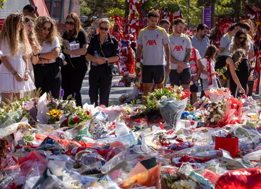Família, Jorge Mendes, jogadores e equipa técnica, depositaram esta sexta-feira flores no memorial criado pelos fãs junto ao estádio do Liverpool, em homenagem aos dois jovens futebolistas que morreram num acidente de viação no dia 3 de julho.