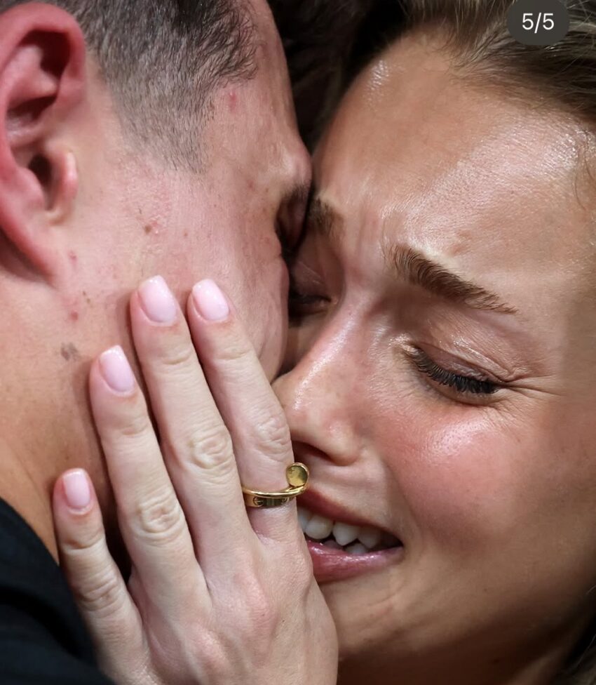 Com muitas lágrimas de alegria, o casal trocou beijos, numa celebração à qual se juntou a família do automobilista de 26 anos.