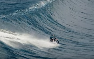 Motociclista faz surf numa onda gigante no Taiti